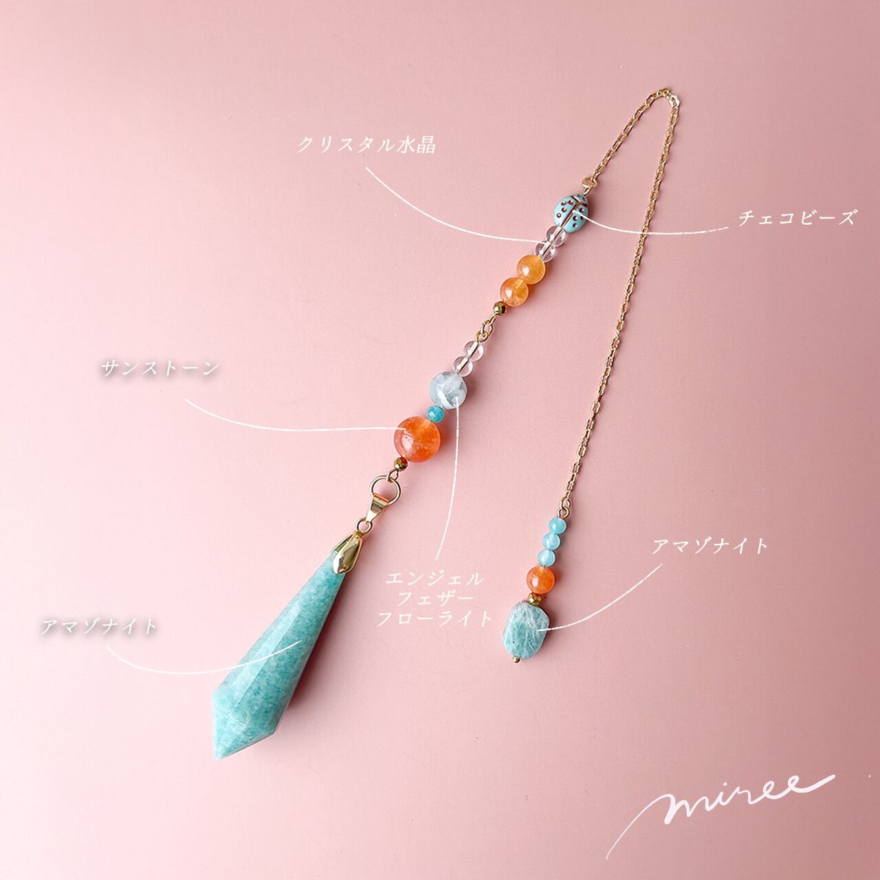 ・使用パーツ:アマゾナイト、サンストーン、エンジェルフェザーフローライト、クリスタル水晶、チェコビーズ(てんとう虫)