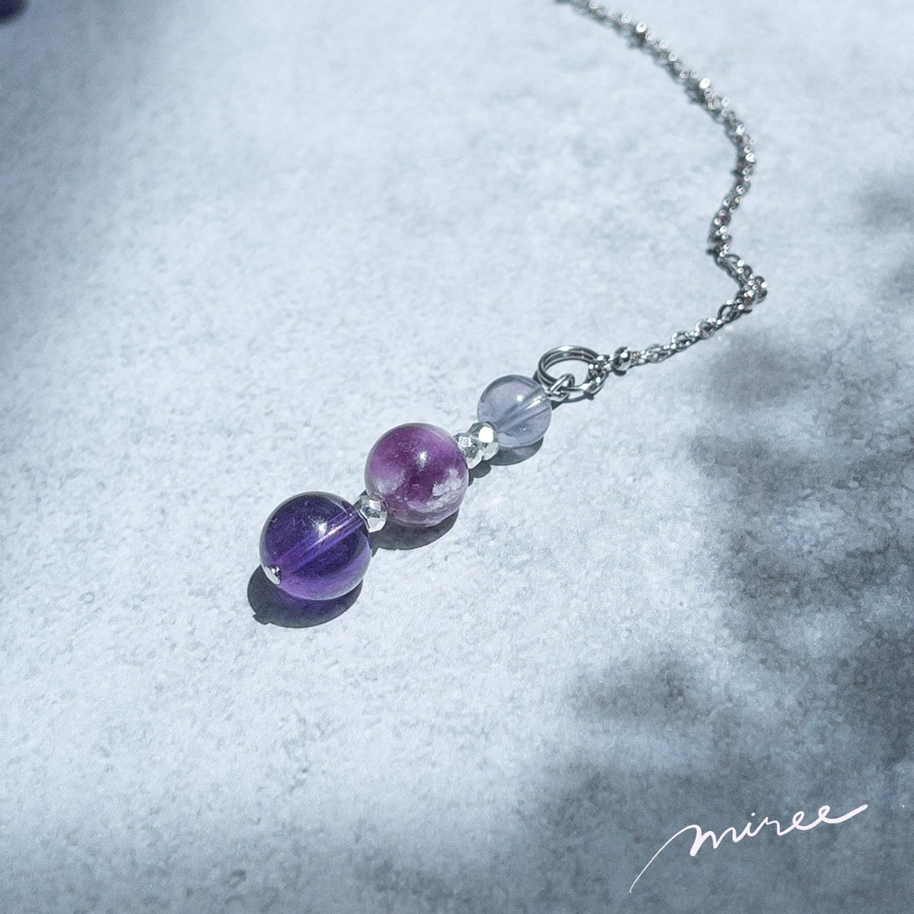 深みのあるアメジストや澄んだアクアブルーが並び、間にはクリアな輝きが呼吸するように差し込まれています。