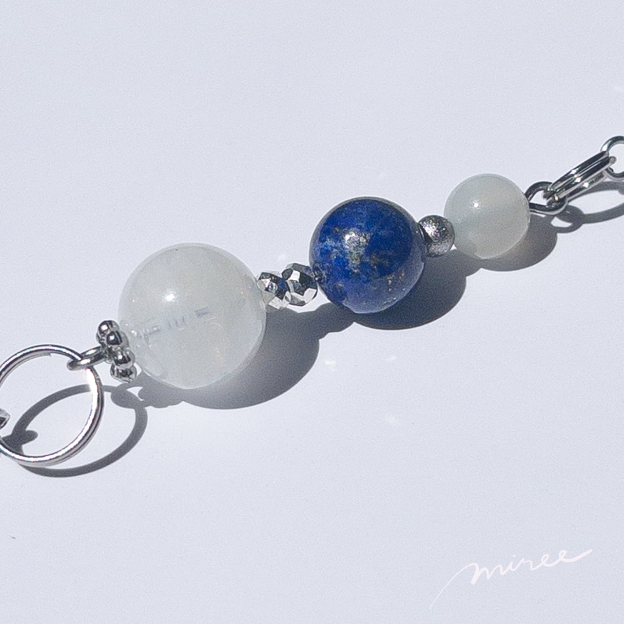 ・使用パーツ:ラピスラズリ、ムーンストーン、ホワイトジェイド、ヘマタイト、チェコビーズ