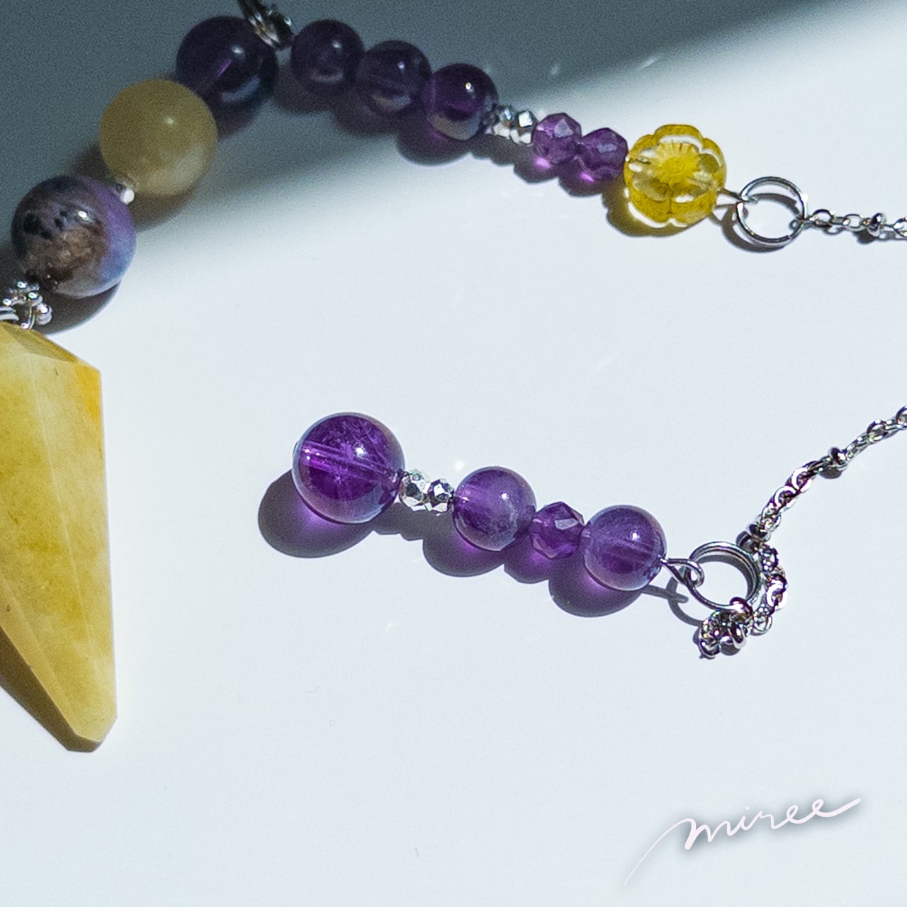・使用パーツ:イエローアベンチュリン、チャロアイト、イエローカルサイト、アメジスト、ヘマタイト、チェコビーズ