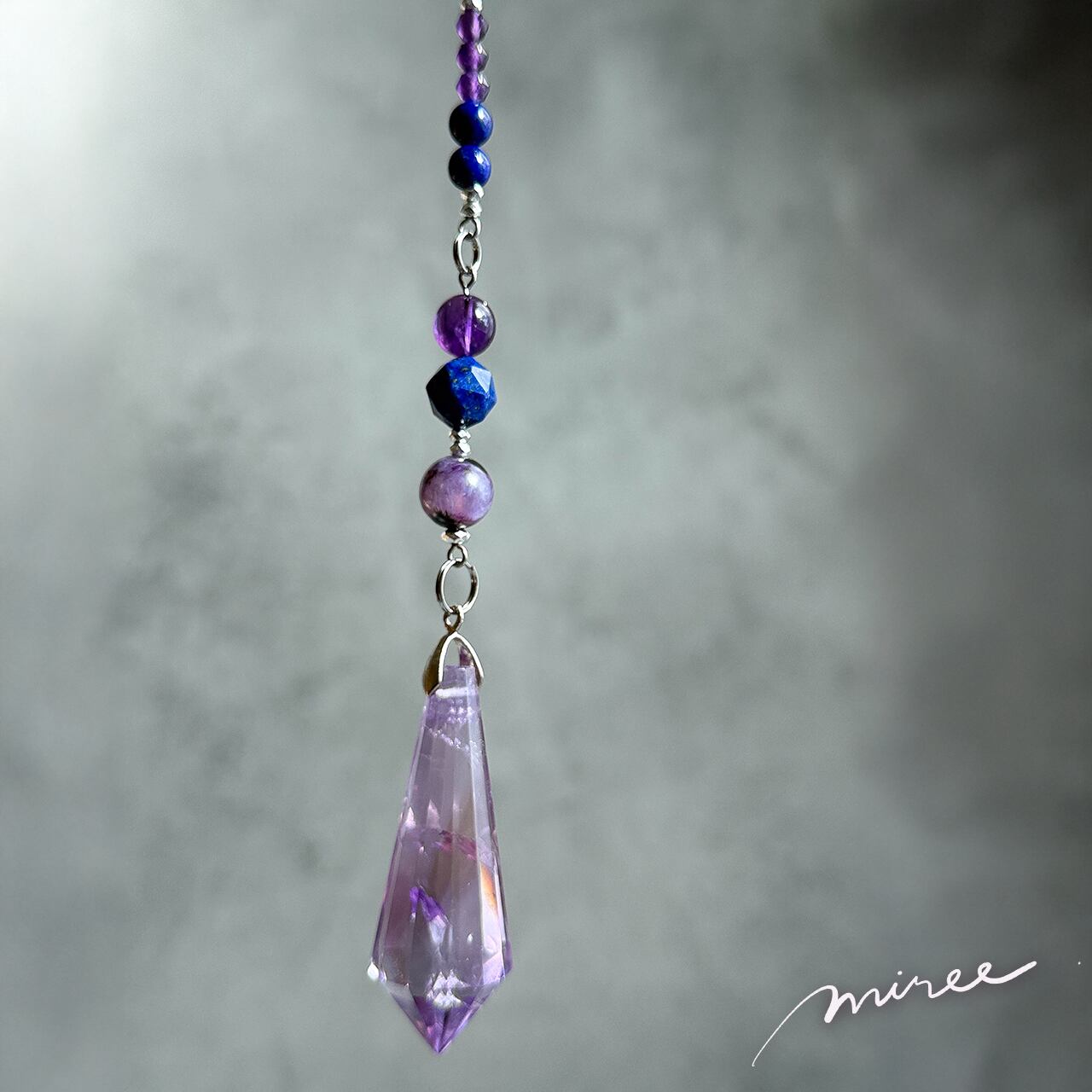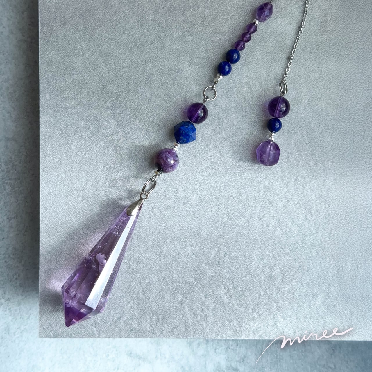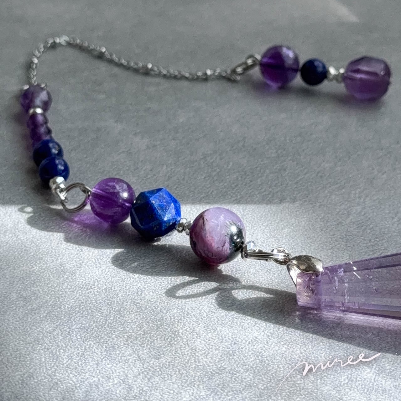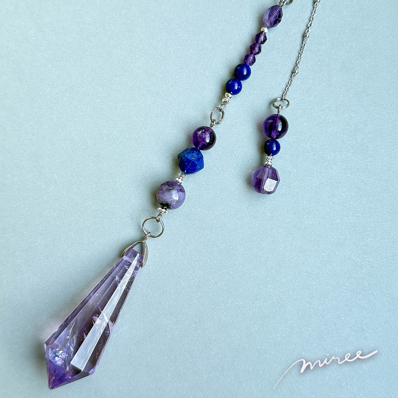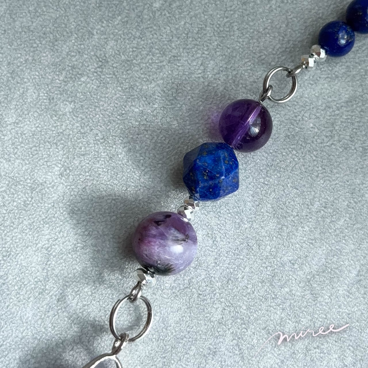 ・使用パーツ:ラベンダーアメジスト(虹入り)、チャロアイト、ラピスラズリ、ヘマタイト