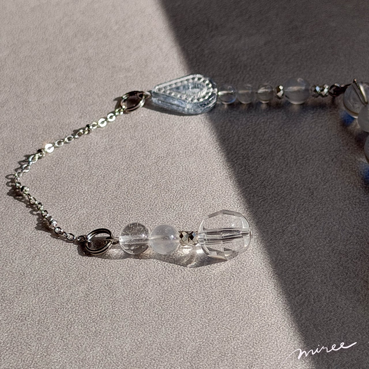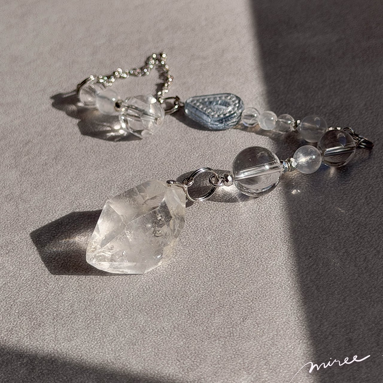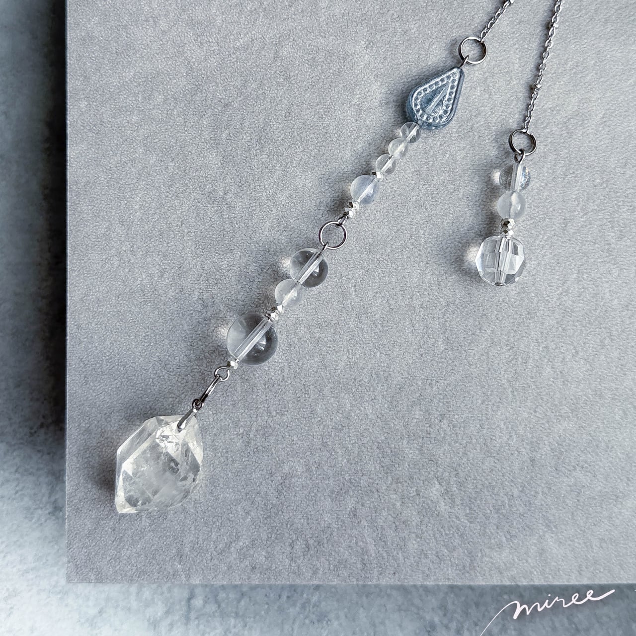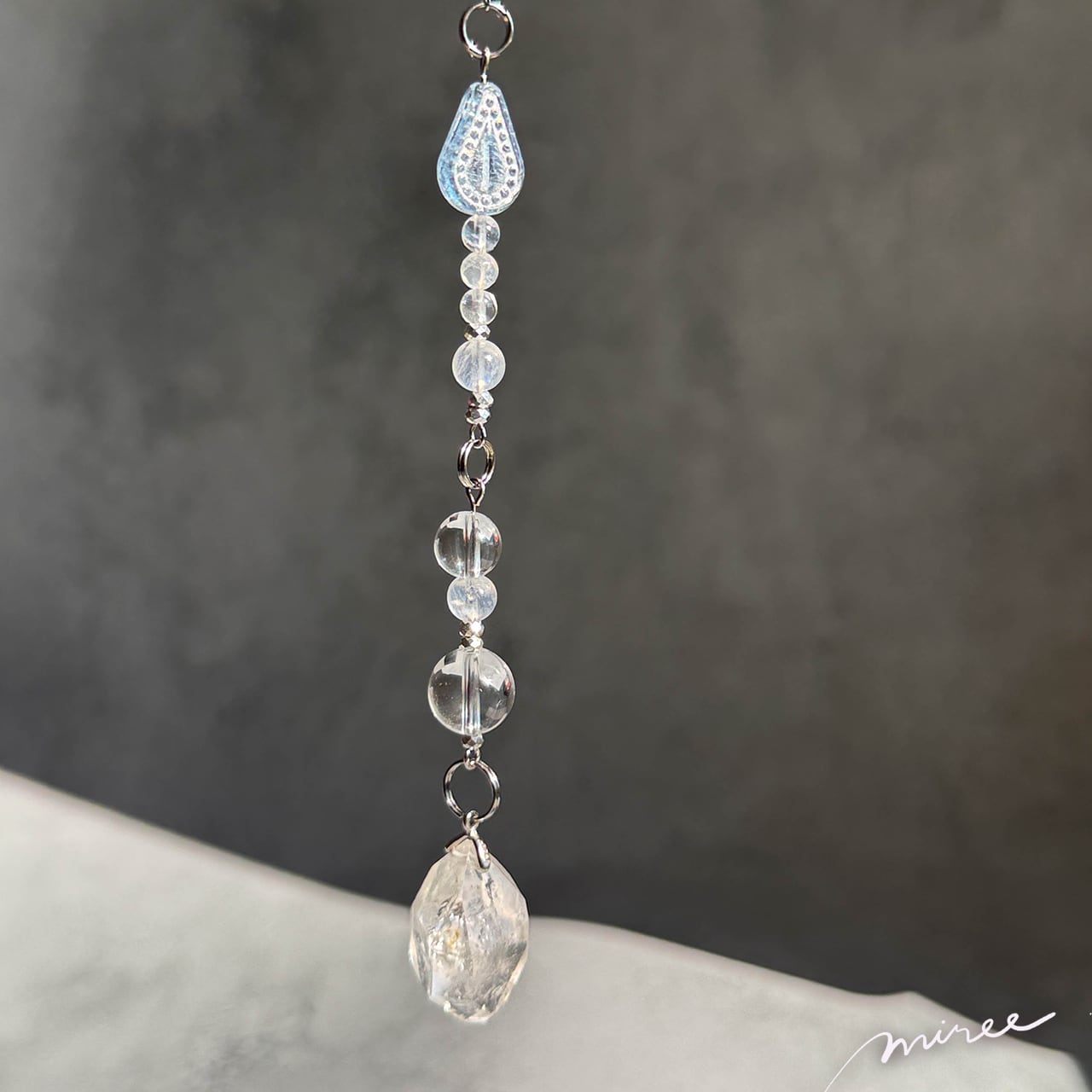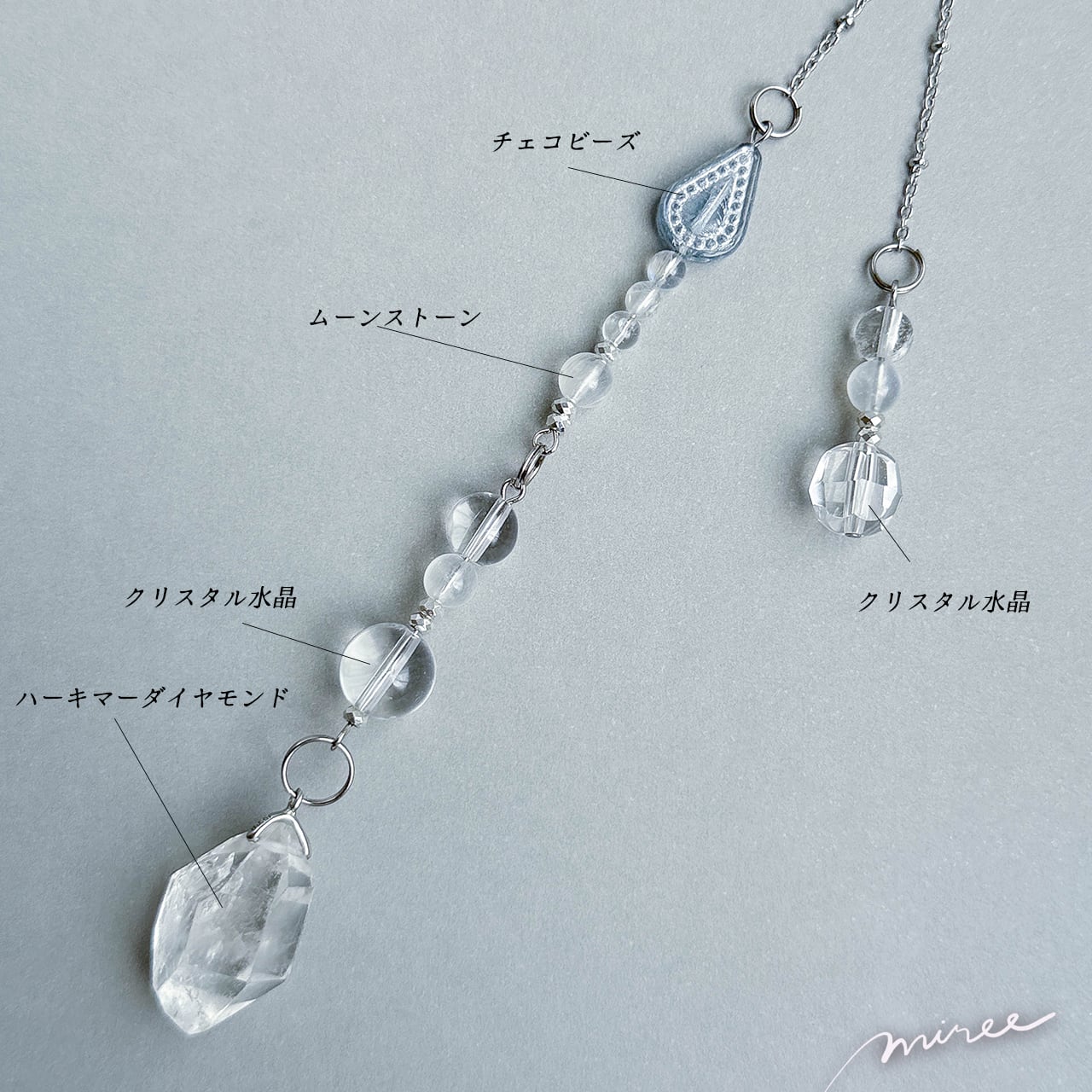 ・使用パーツ:ハーキマーダイヤモンド(虹入り)、ムーンストーン、クリスタル水晶、ヘマタイト、チェコビーズ