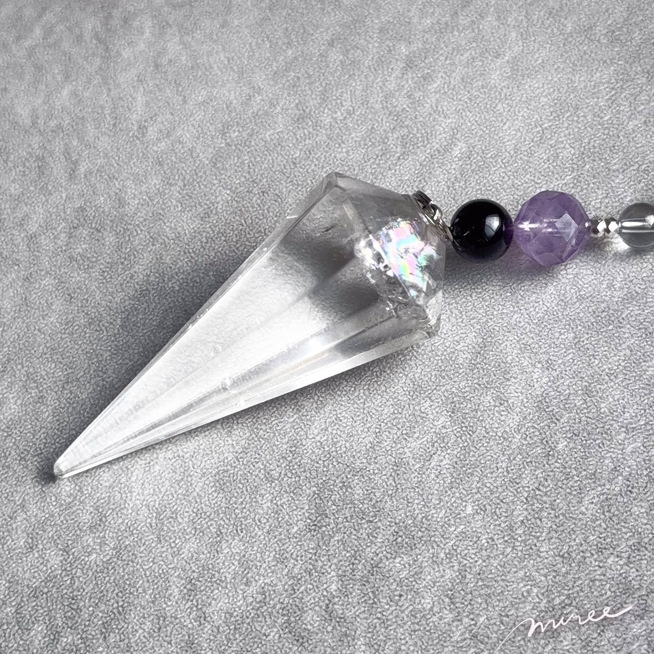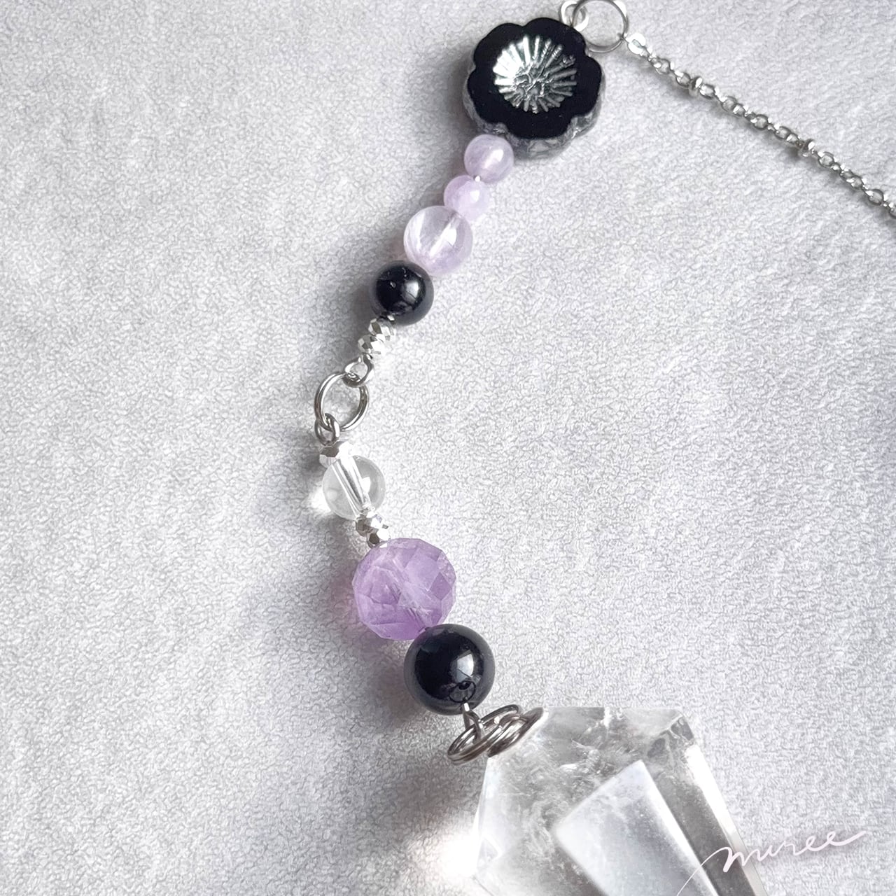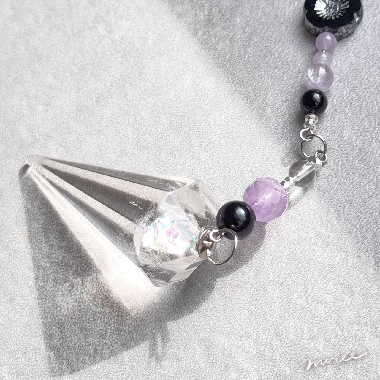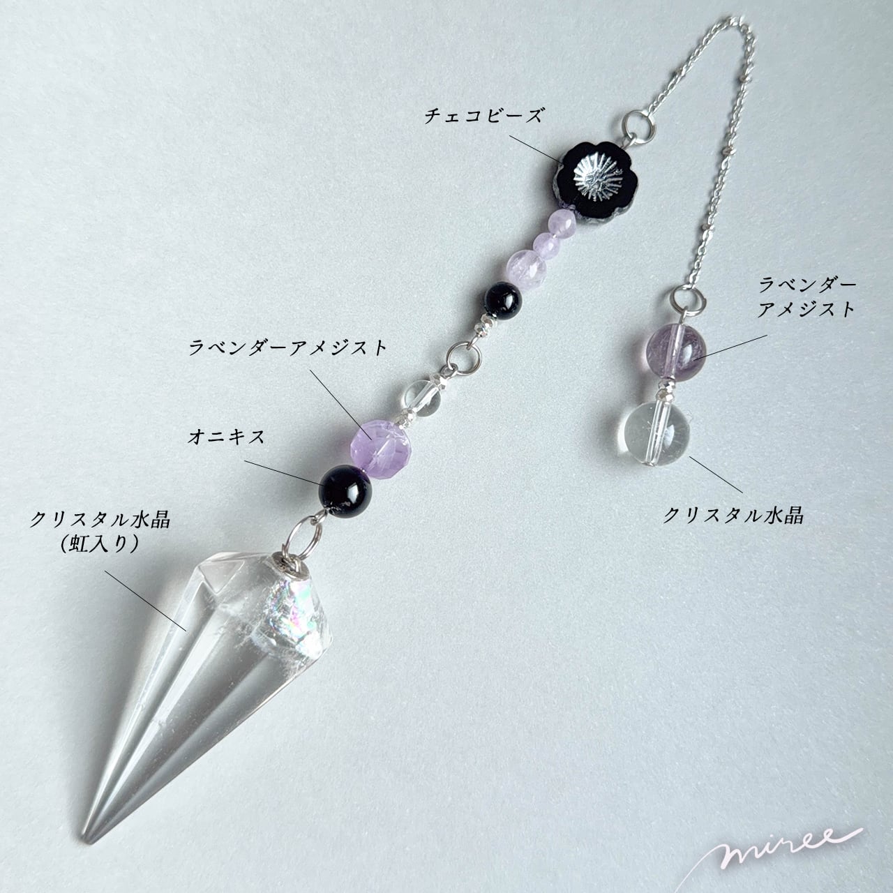 ・使用パーツ:クリスタル水晶(虹入り)、オニキス、ラベンダーアメジスト、ヘマタイト、チェコビーズ