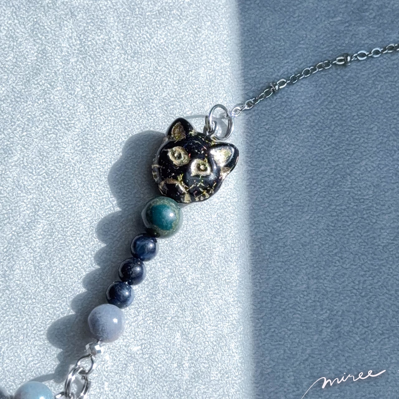 チェコビーズの黒猫が、静かなまなざしで見守りながら、