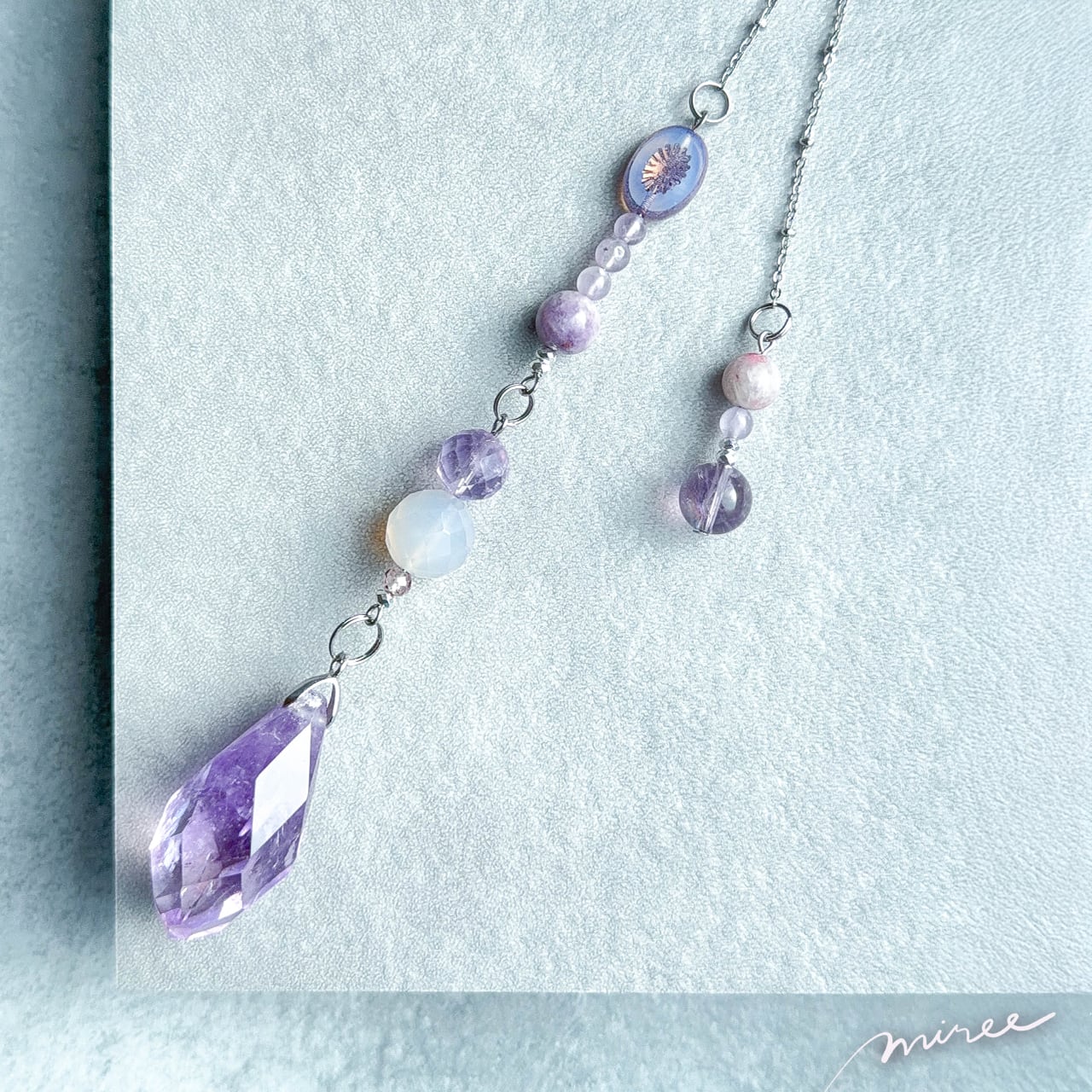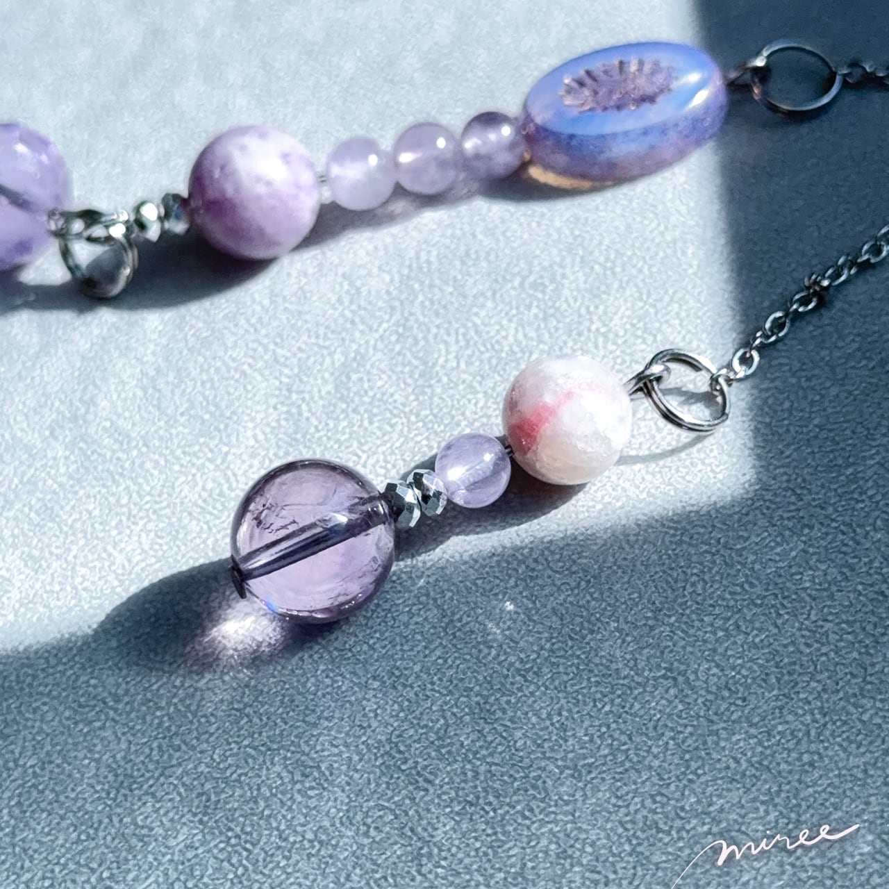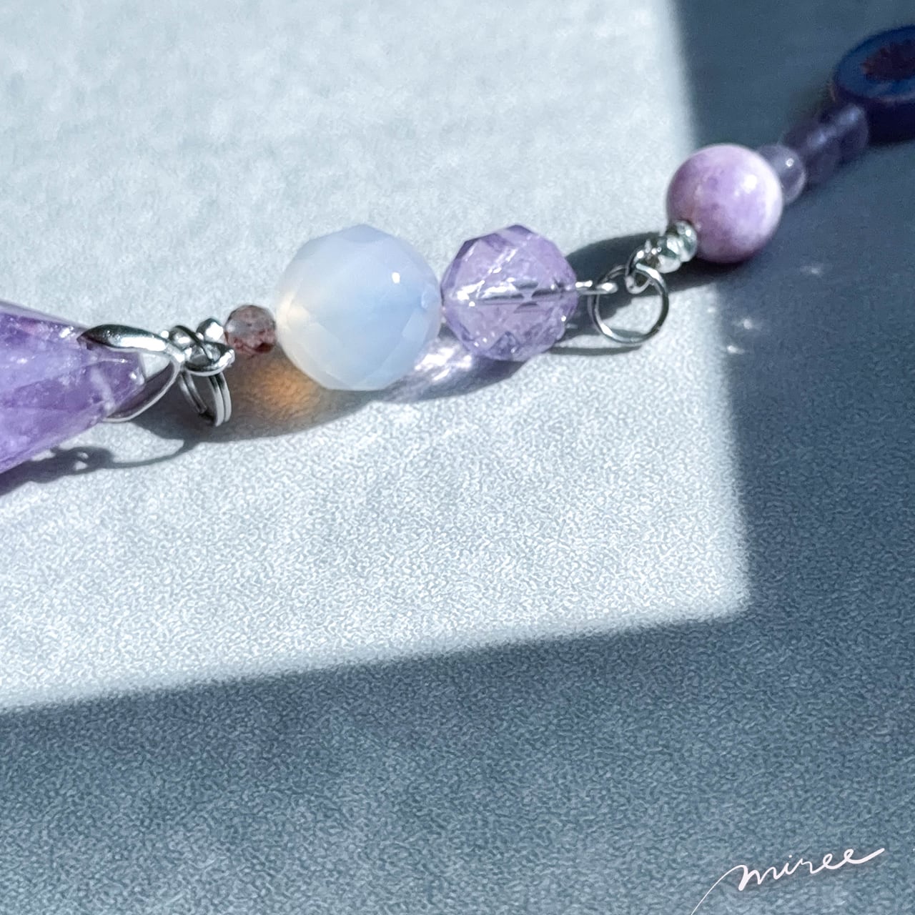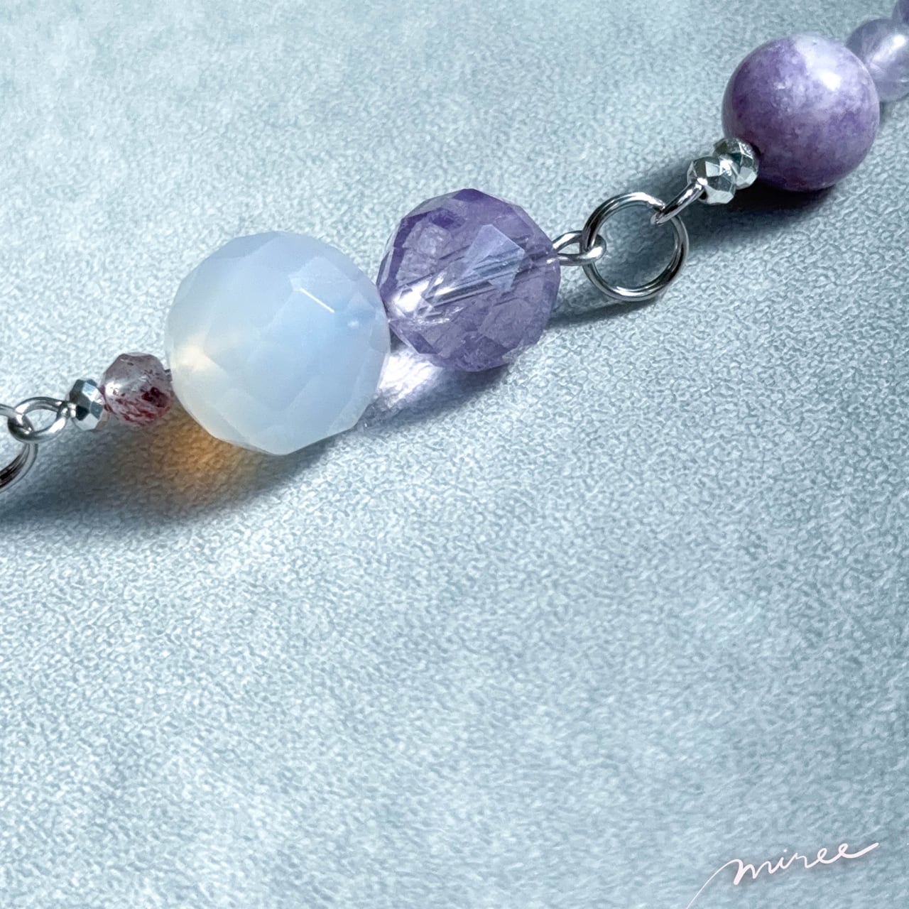 ・使用パーツ:ラベンダーアメジスト、ホワイトカルセドニー、レピドライト、ヘマタイト、チェコビーズ