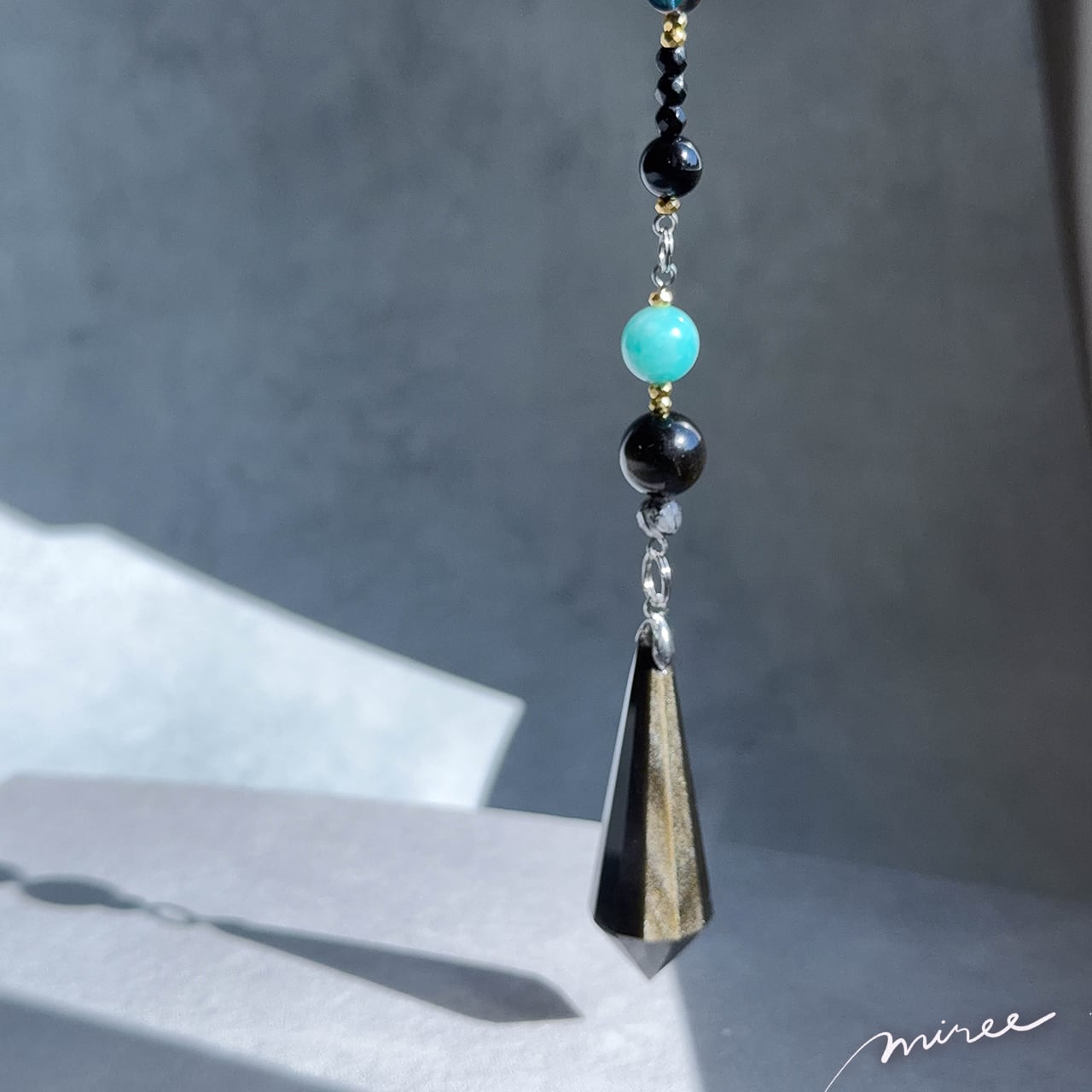 ・使用パーツ:ゴールデンオブシディアン、ブラックトルマリン、アマゾナイト、オニキス、ヘマタイト、チェコビーズ