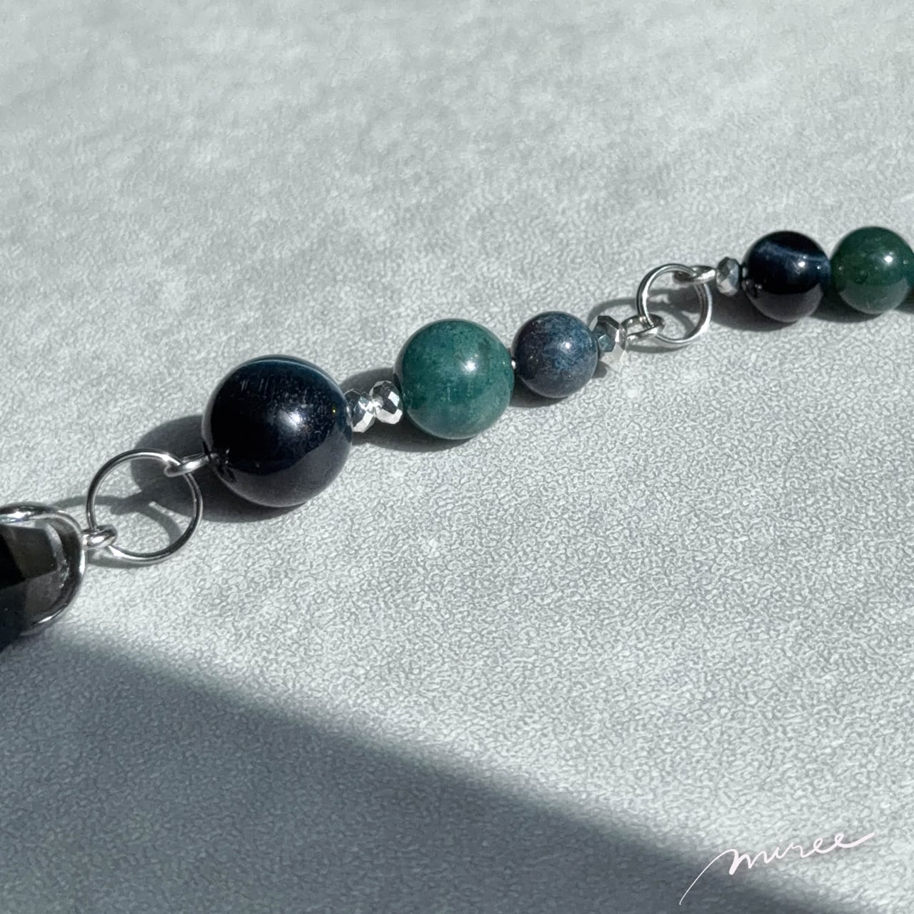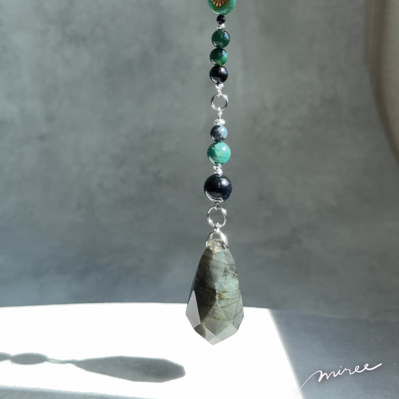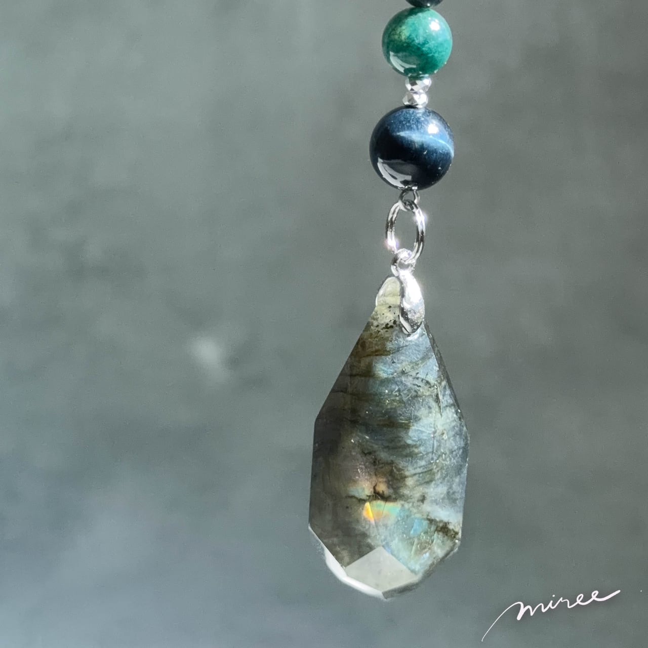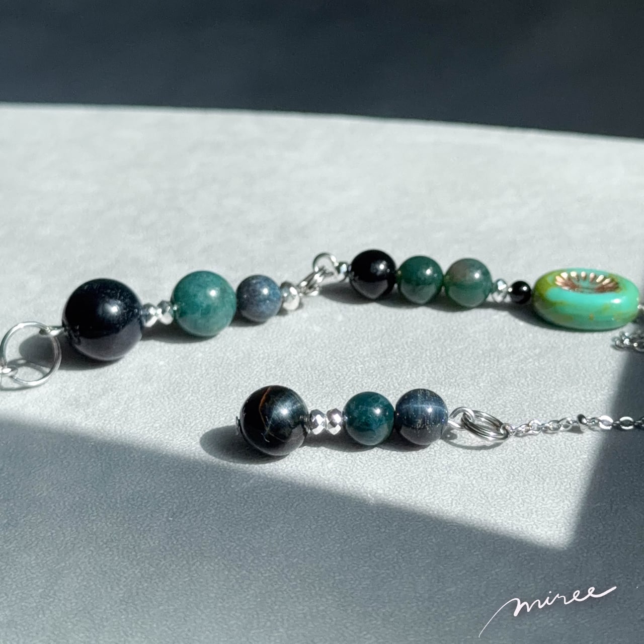 ・使用パーツ:ラブラドライト、ブルータイガーアイ、モスアゲート、ヘマタイト、チェコビーズ