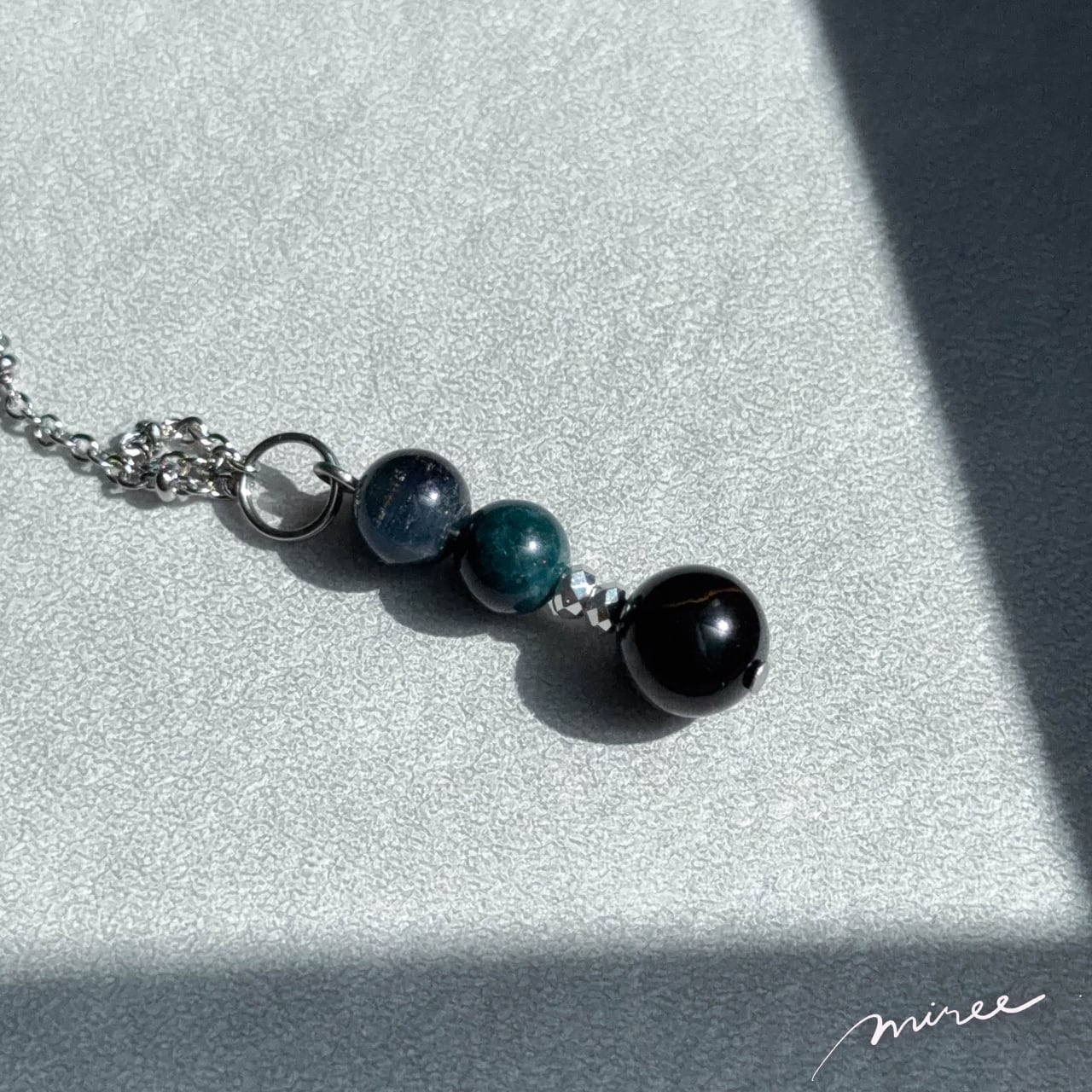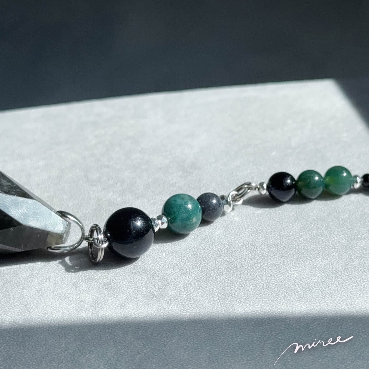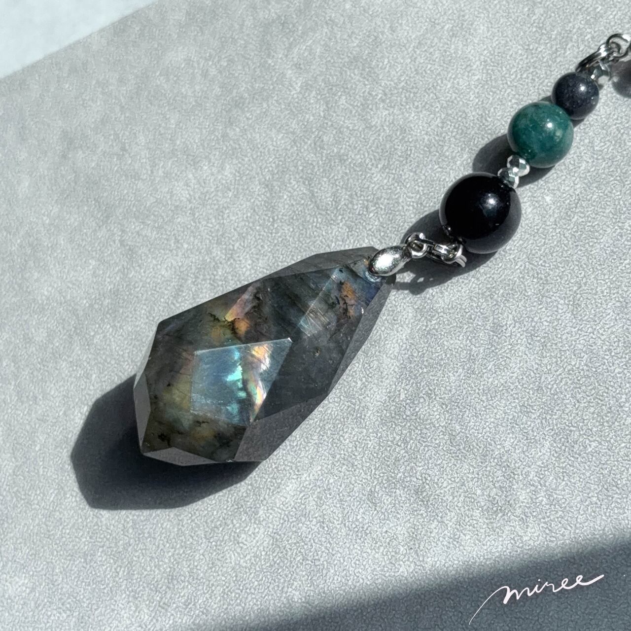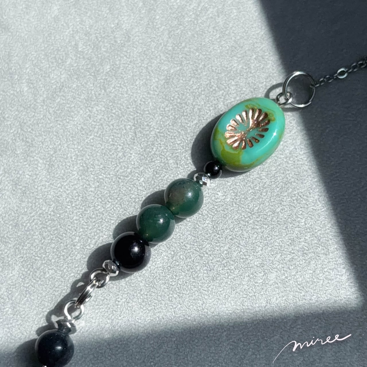 ・使用パーツ:ラブラドライト、ブルータイガーアイ、モスアゲート、ヘマタイト、チェコビーズ