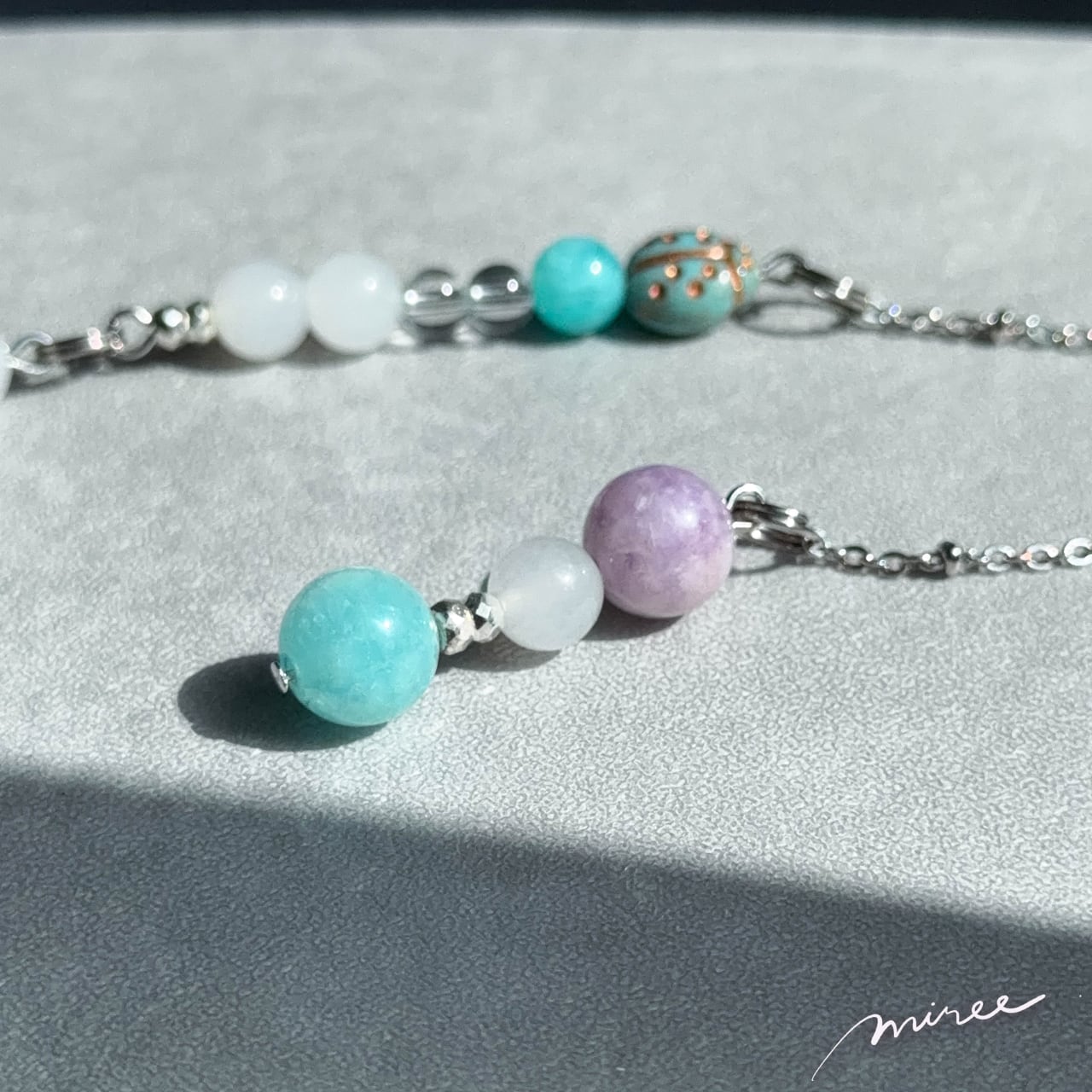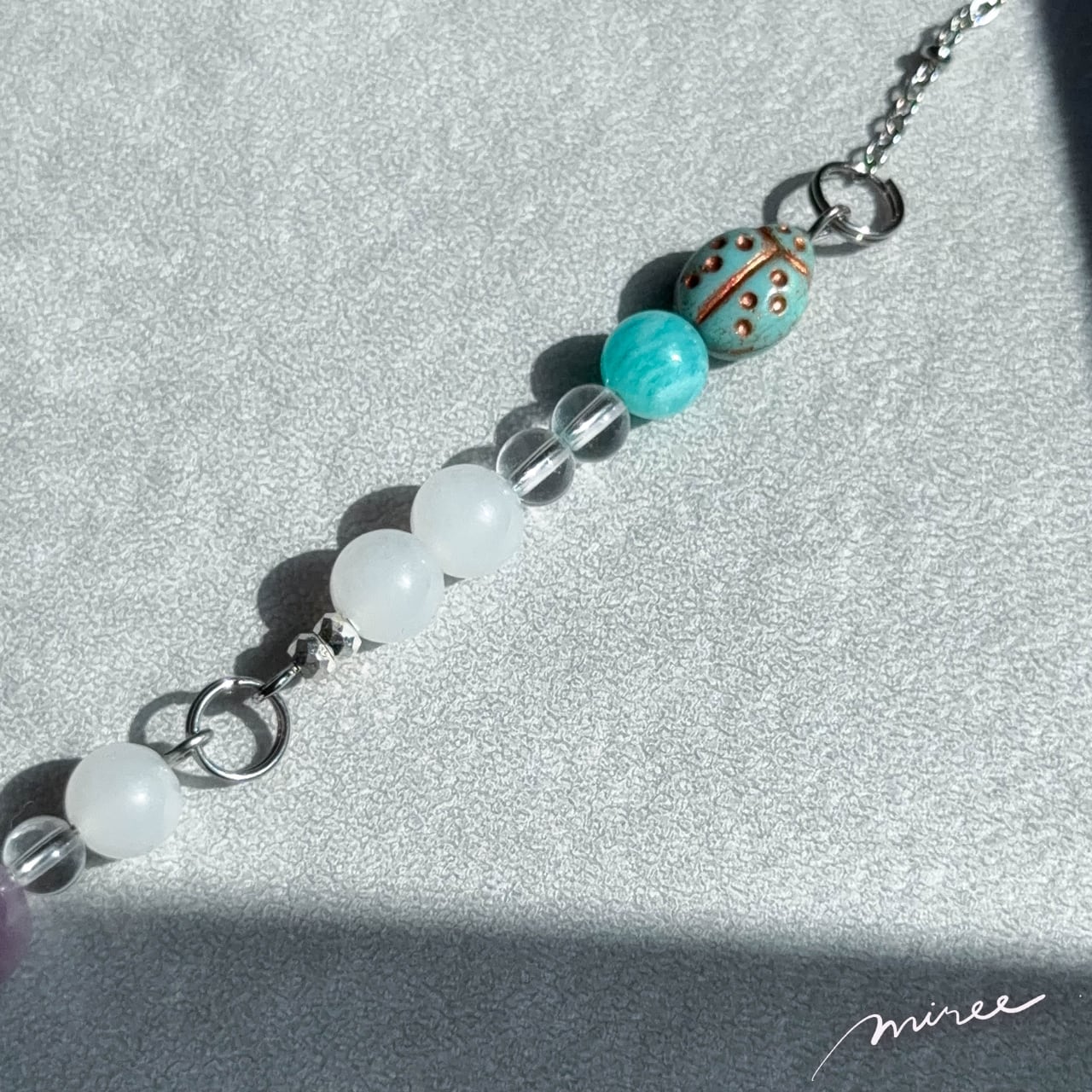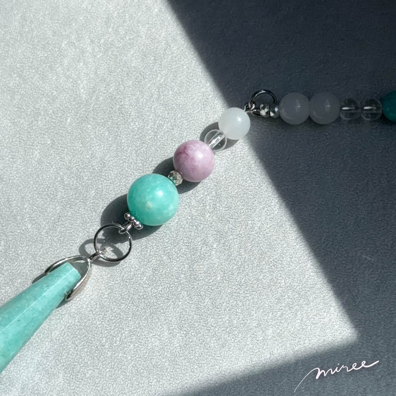 ・使用パーツ:アマゾナイト、レピドライト、ホワイトジェード、クリスタル水晶、ヘマタイト、チェコビーズ