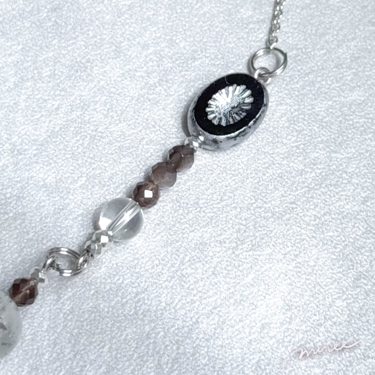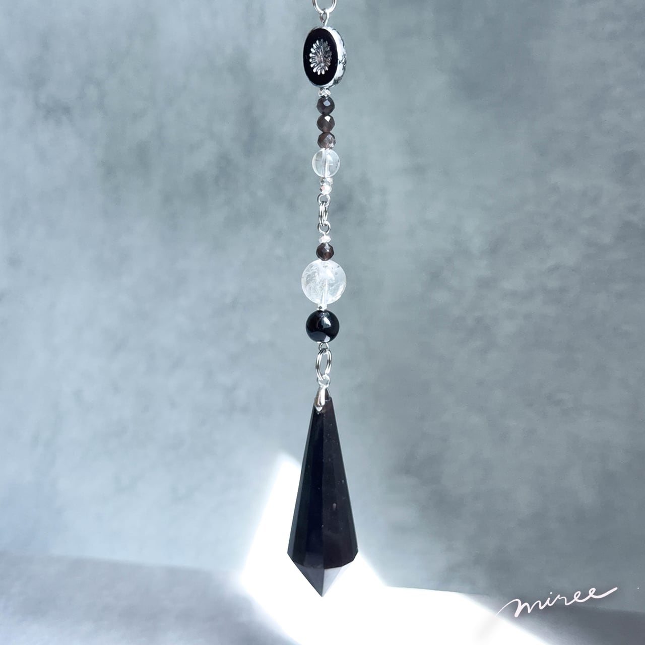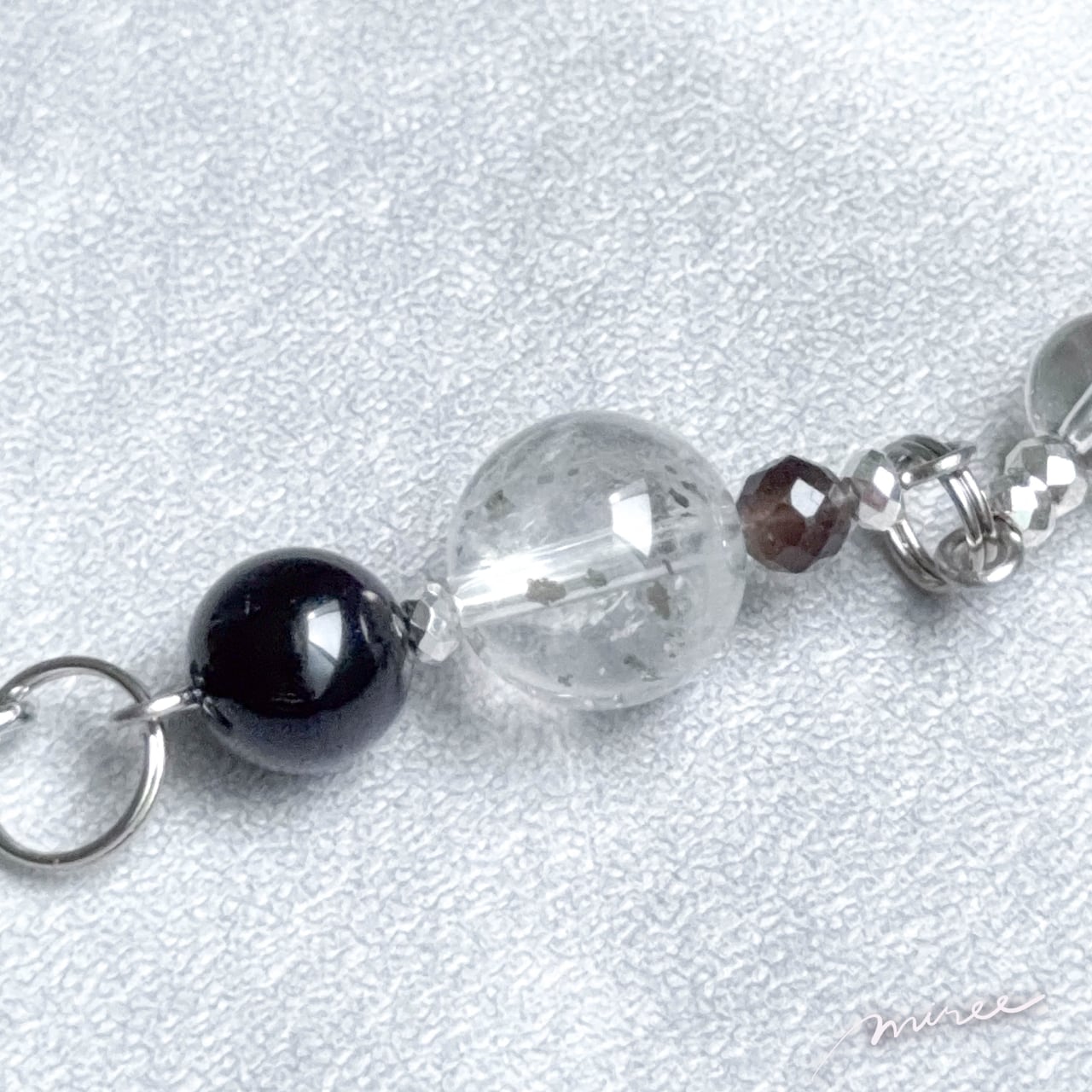 ・使用パーツ:シルバーオブシディアン、パイライトインクォーツ、オニキス、クリスタル水晶、ヘマタイト、チェコビーズ