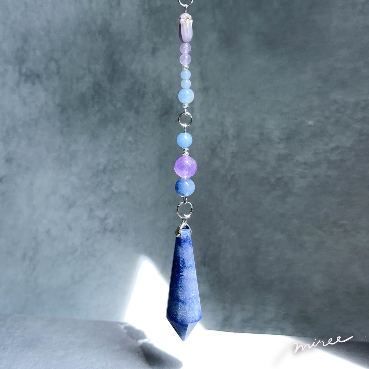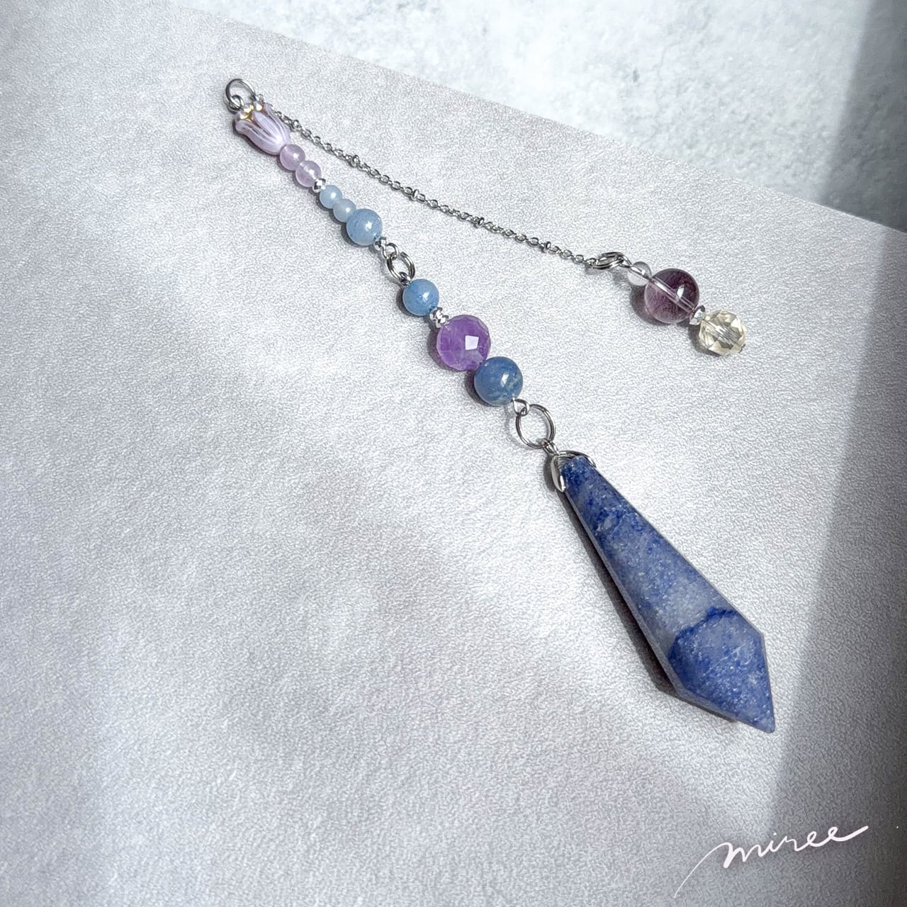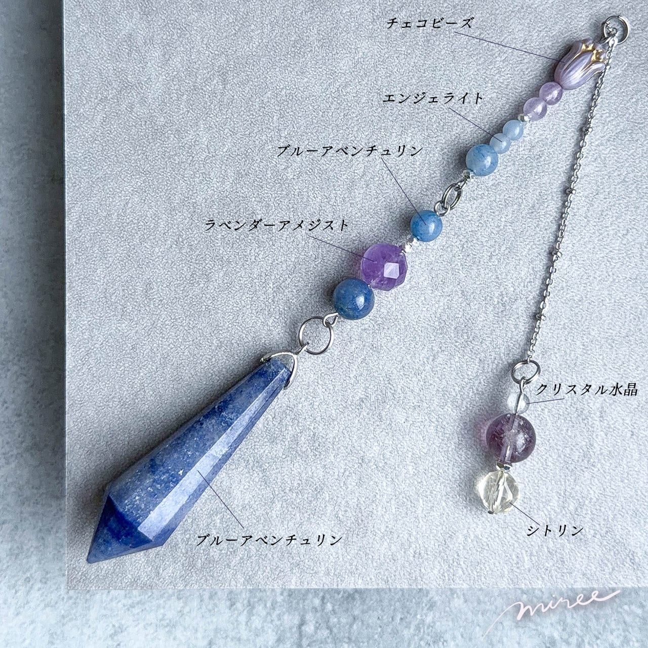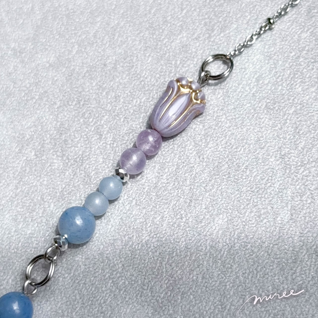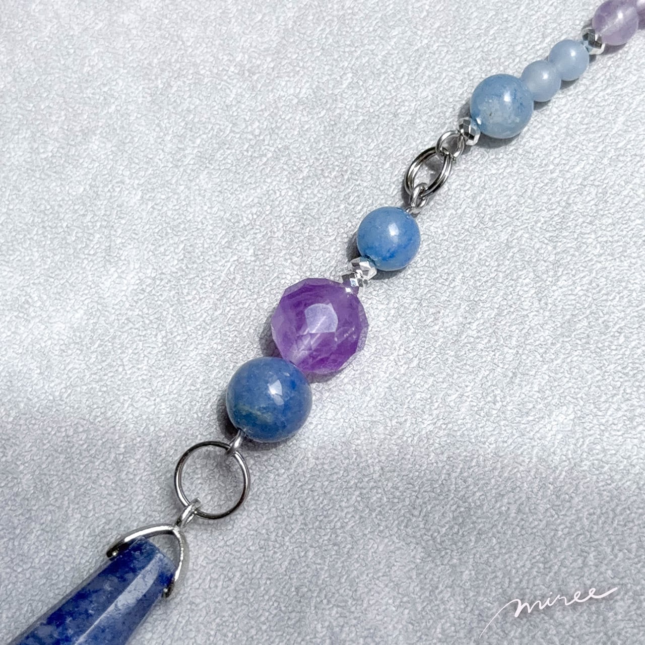 ・使用パーツ:ブルーアベンチュリン、ラベンダーアメジスト、エンジェライト、シトリン、クリスタル水晶、ヘマタイト、チェコビーズ